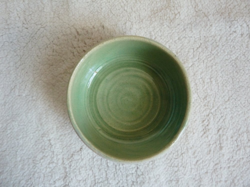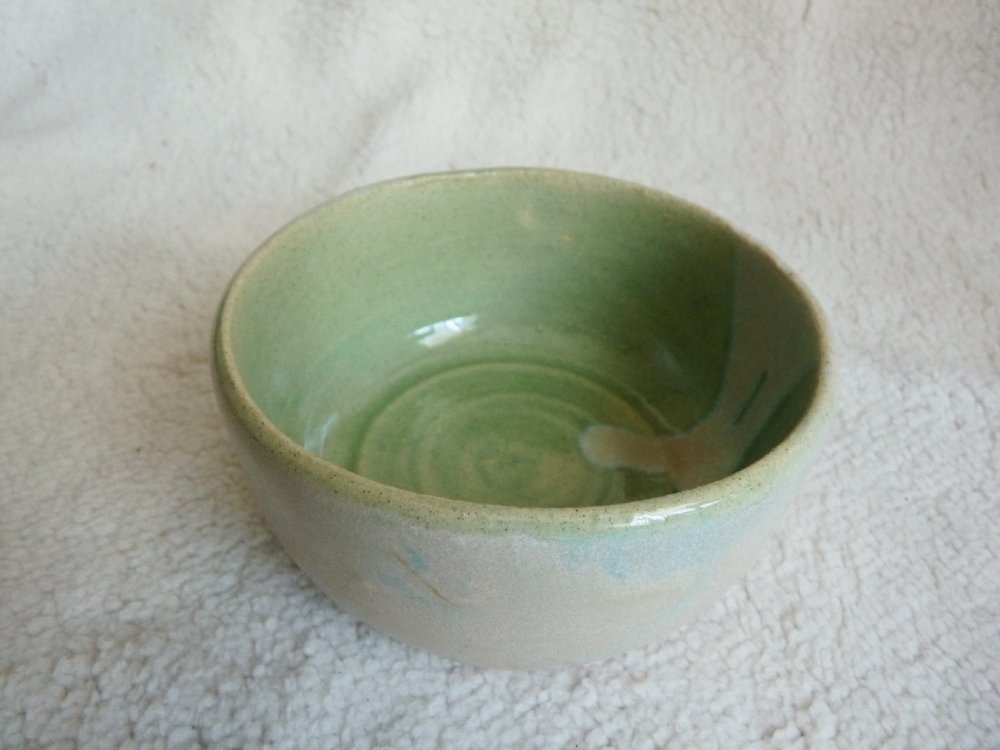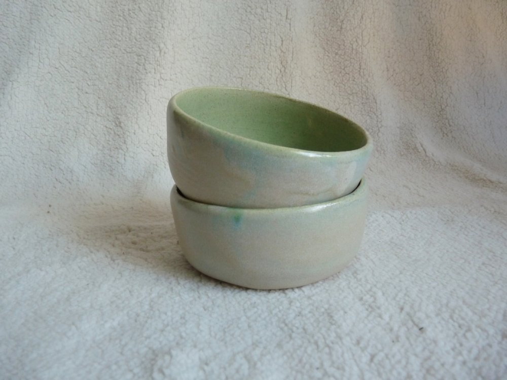 Grès blanc chamotté tourné. Email coloré différent à l’intérieur (turquoise brillant) et à l’extérieur (beige mat).