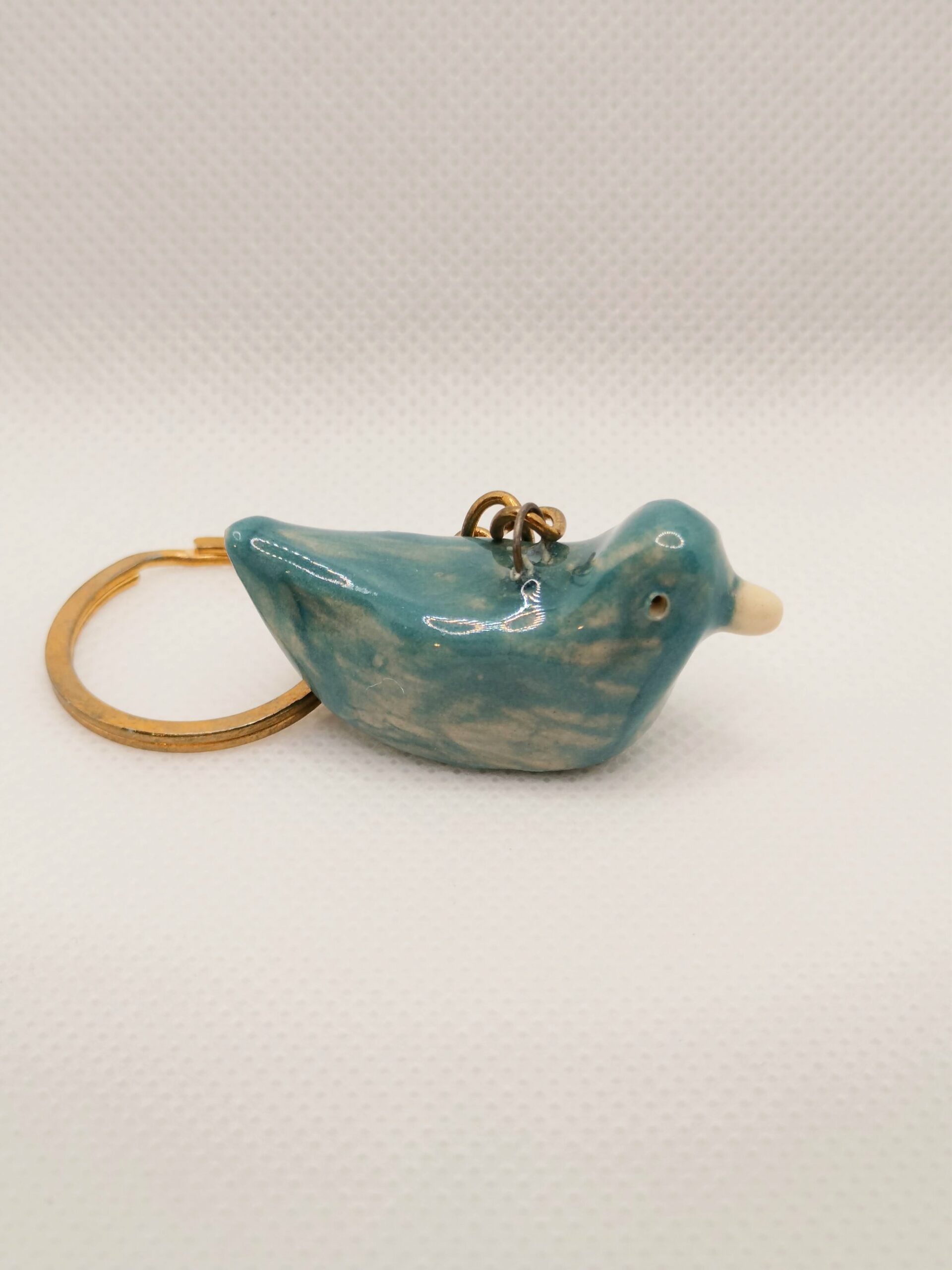 Grès blanc façonné à la main, engobe coloré, couverte transparente. Le grès est très solide et saura résister attaché à vos clés.