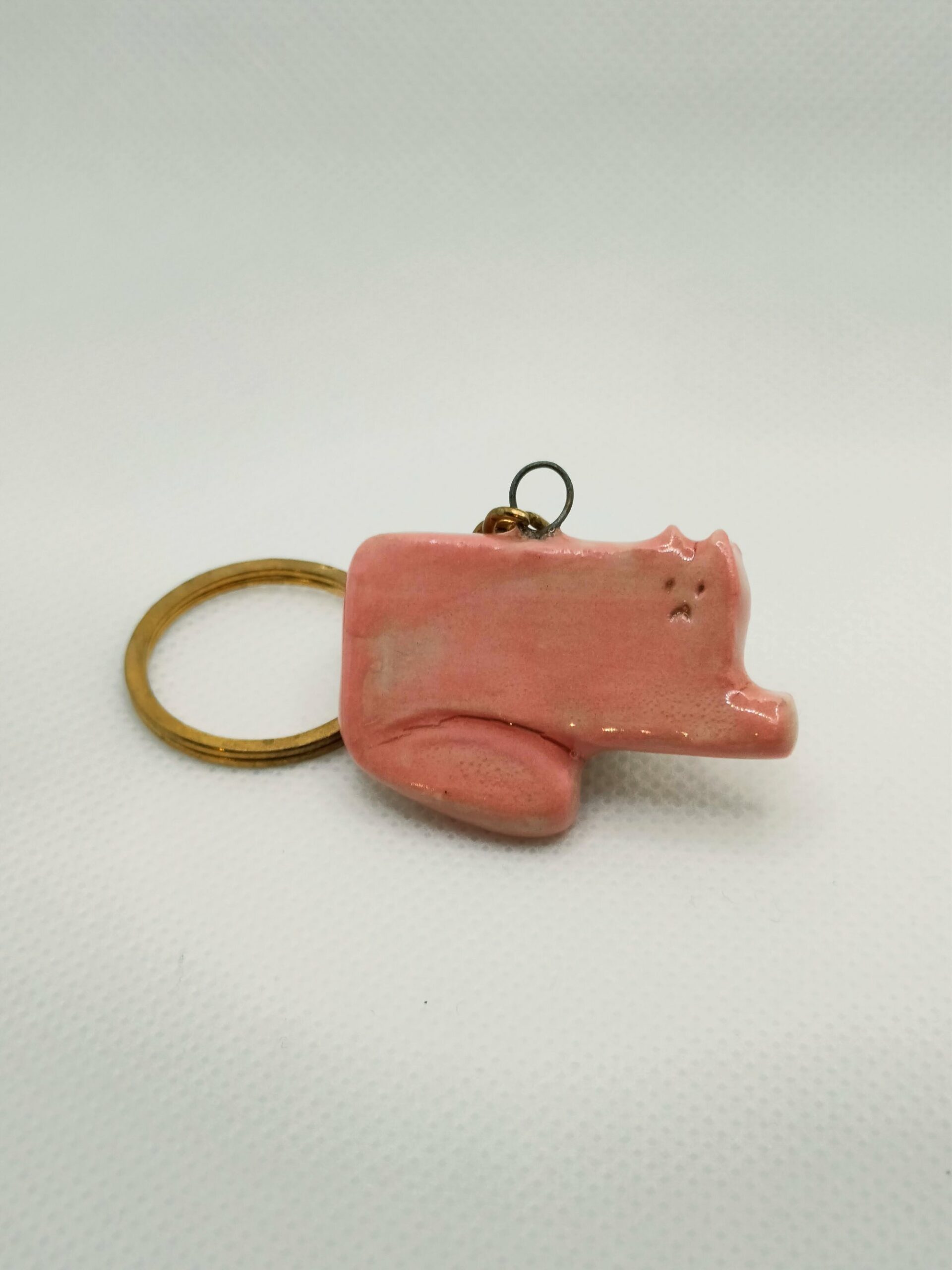 Grès blanc façonné à la main, engobe coloré, couverte transparente. Le grès est très solide et saura résister attaché à vos clés.